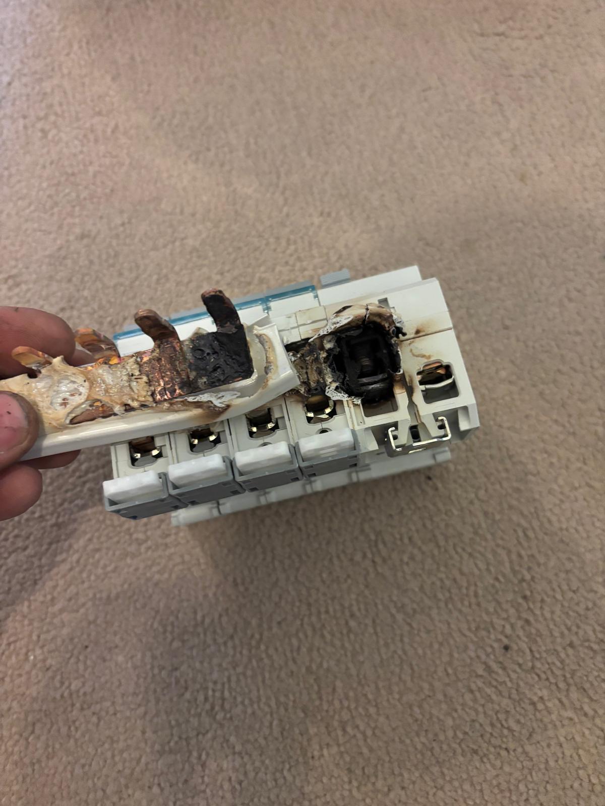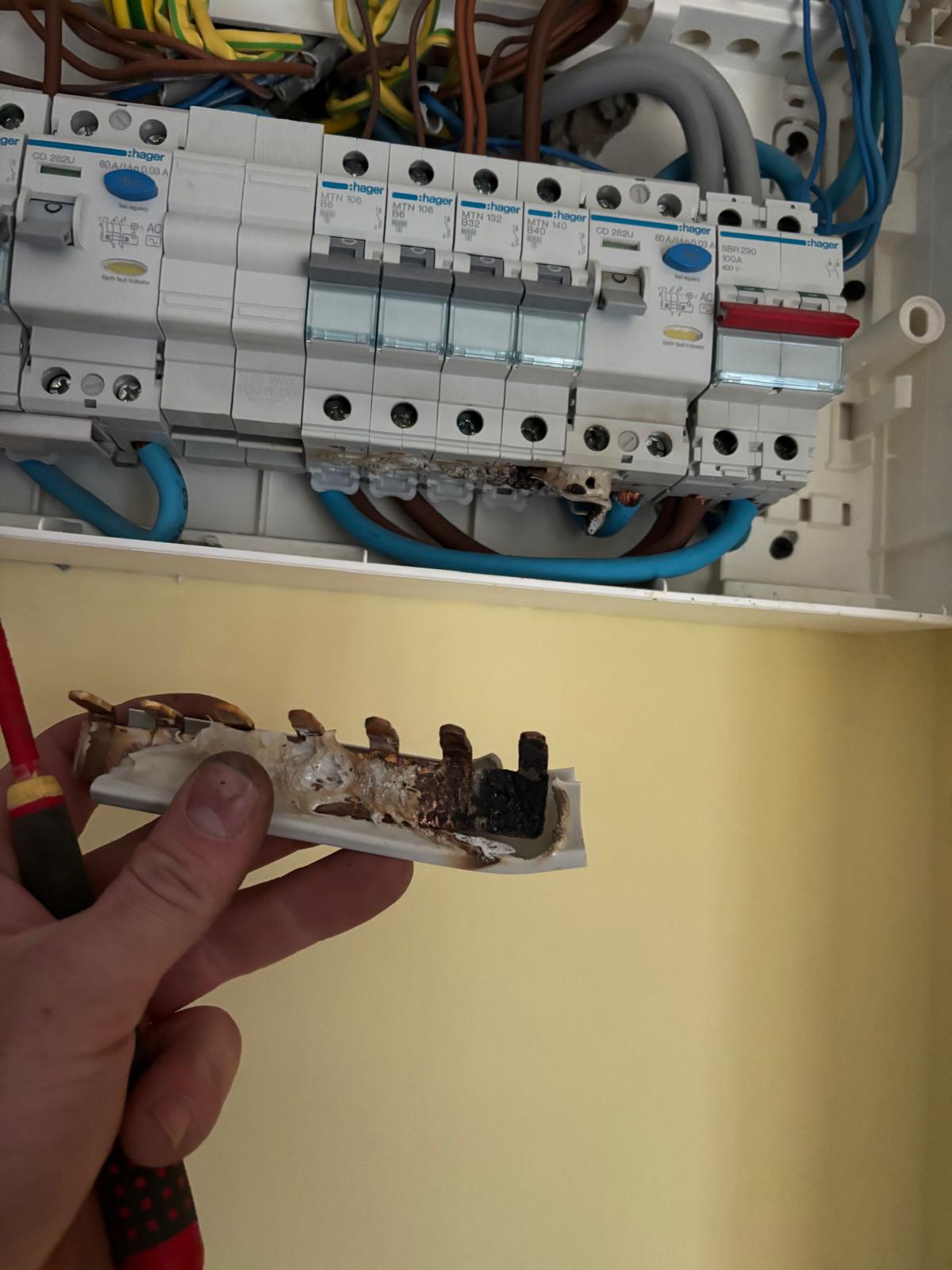 After safely isolating the supply and removing the consumer unit cover, the fault became obvious straight away. As you can see from the photos, parts of the consumer unit were visibly melting, with clear heat damage around the affected components.